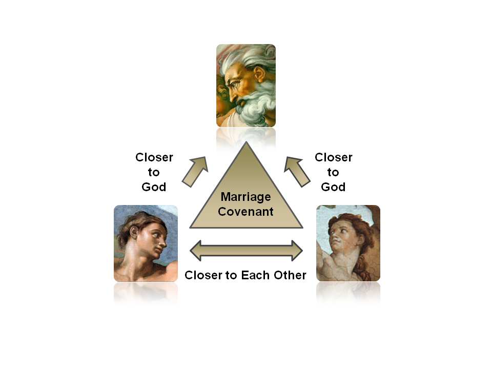 In the Catholic context, spouses have the duty to first develop their relationship with God. Participation in the Sacraments, especially the Eucharist, provides the couple with the grace needed to live out their vocation to marriage. In the illustration below, the triangle represents the marriage covenant between the spouses and God, an image of the Holy Trinity, Father, Son and Holy Spirit.